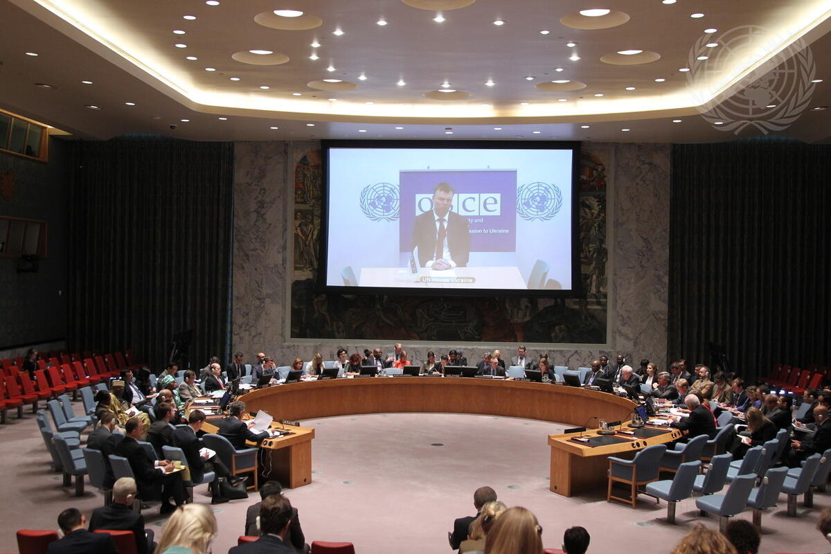 Alexander Hug (on screen), Deputy Chief Monitor of the Organization for Security and Co-operation in Europe (OSCE) Special Monitoring Mission to Ukraine, briefs the Security Council via video conference.