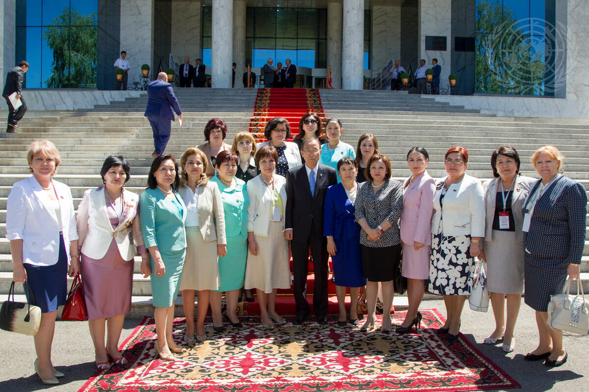 Secretary-General Ban Ki-moon poses for a group photo with women members of the Parliament of the Kyrgyz Republic.