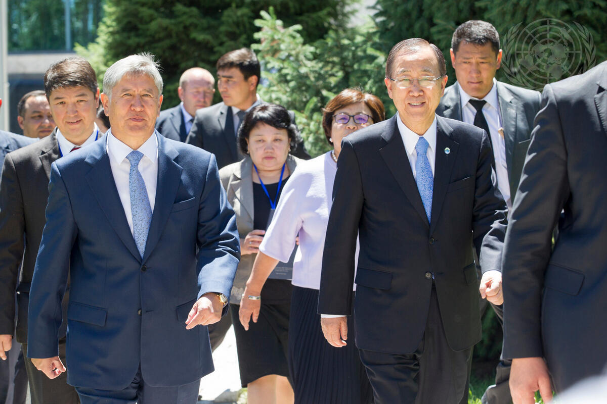 Secretary-General Ban Ki-moon (second from right) on his way to a joint press conference with Almazbek] Atambaev (second from left), President of the Kyrgyz Republic, in Bishkek.