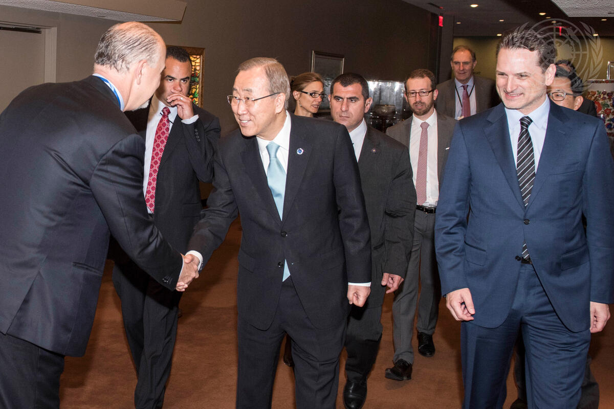Secretary-General Ban Ki-moon (centre left) arrives with Pierre Krähenbühl (right), Commissioner-General of the UN Relief and Works Agency for Palestine Refugees in the Near East (UNRWA), for a commemorative event marking the 65th anniversary of UNRWA.