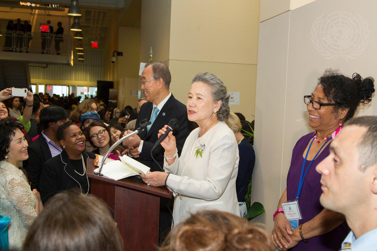 Yoo Soon-taek (centre right), wife of Secretary-General Ban Ki-moon, speaks at the event. On her right is Mr. Ban.