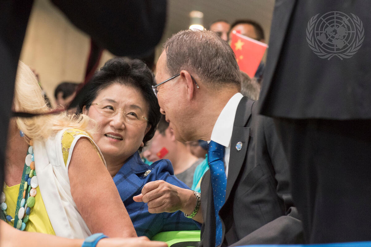 Secretary-General Ban Ki-moon (right) chats with Liu Yandong, Vice Premier of the People's Republic of China, during an air rifle event on the first day of the 2016 Summer Olympic Games.