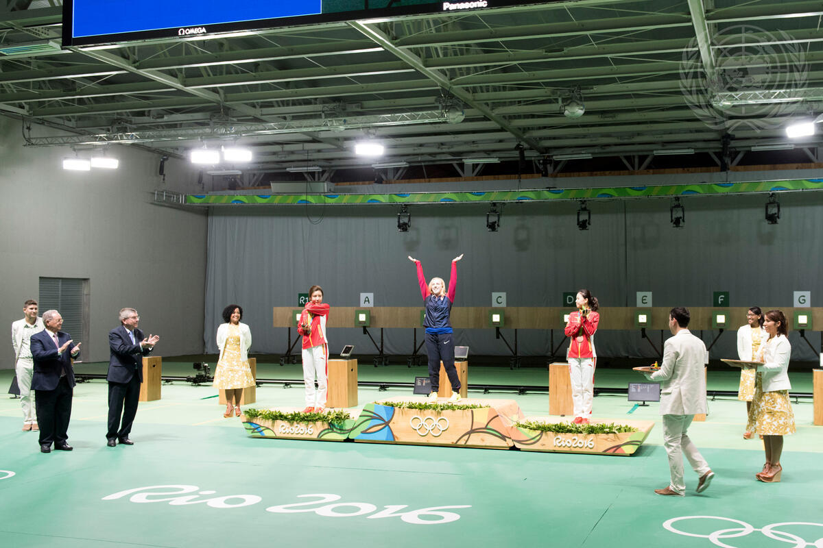 Winners of the women's 10-metre air rifle shooting competition at the 2016 Summer Olympic Games in Rio de Janeiro: United States gold medalist Ginny Thrasher (centre) flanked by silver medalist Du Li of China (left) and bronze medalist Yi Siling of China.