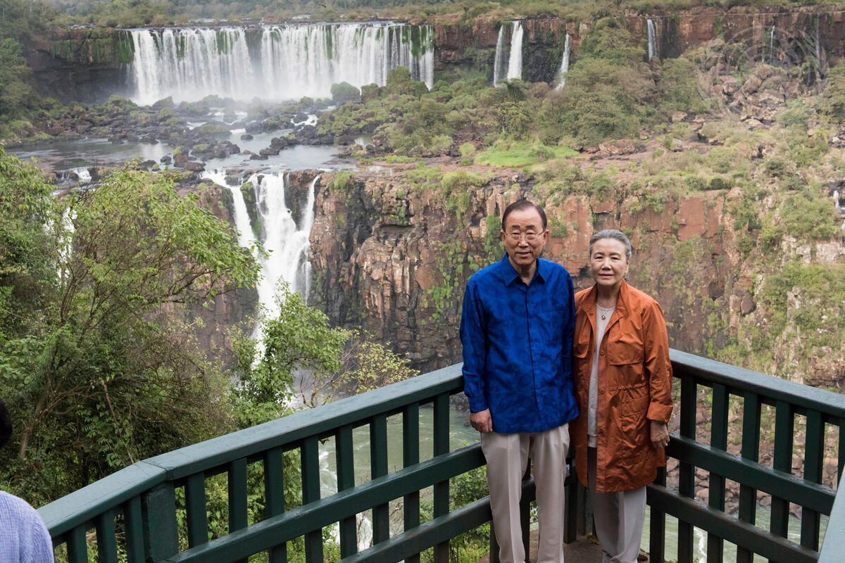 Secretary-General Ban Ki-moon (left) and his wife, Yoo Soon-taek, tour Iguazu Falls, Brazil, one of the UNESCO World Heritage Sites.