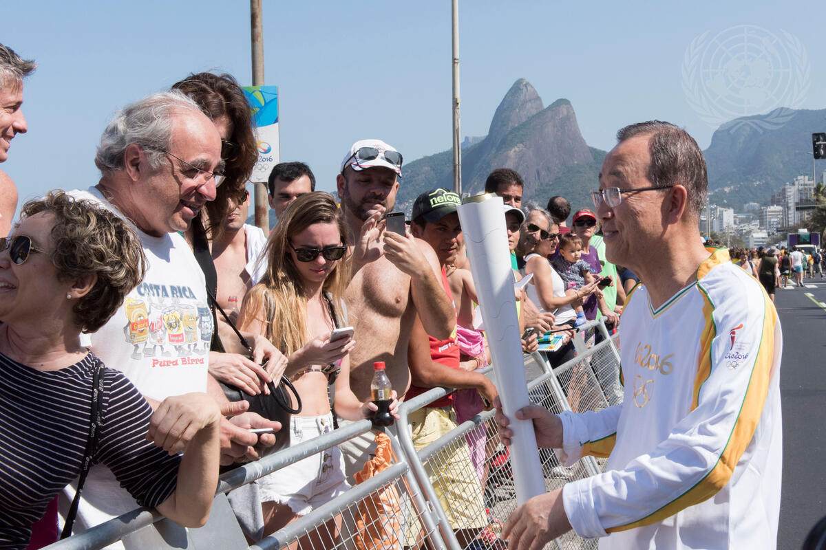 Secretary-General Ban Ki-moon takes part in the Olympic torch relay ahead of the opening ceremony of the 2016 Summer Olympic Games in Rio de Janeiro, Brazil.