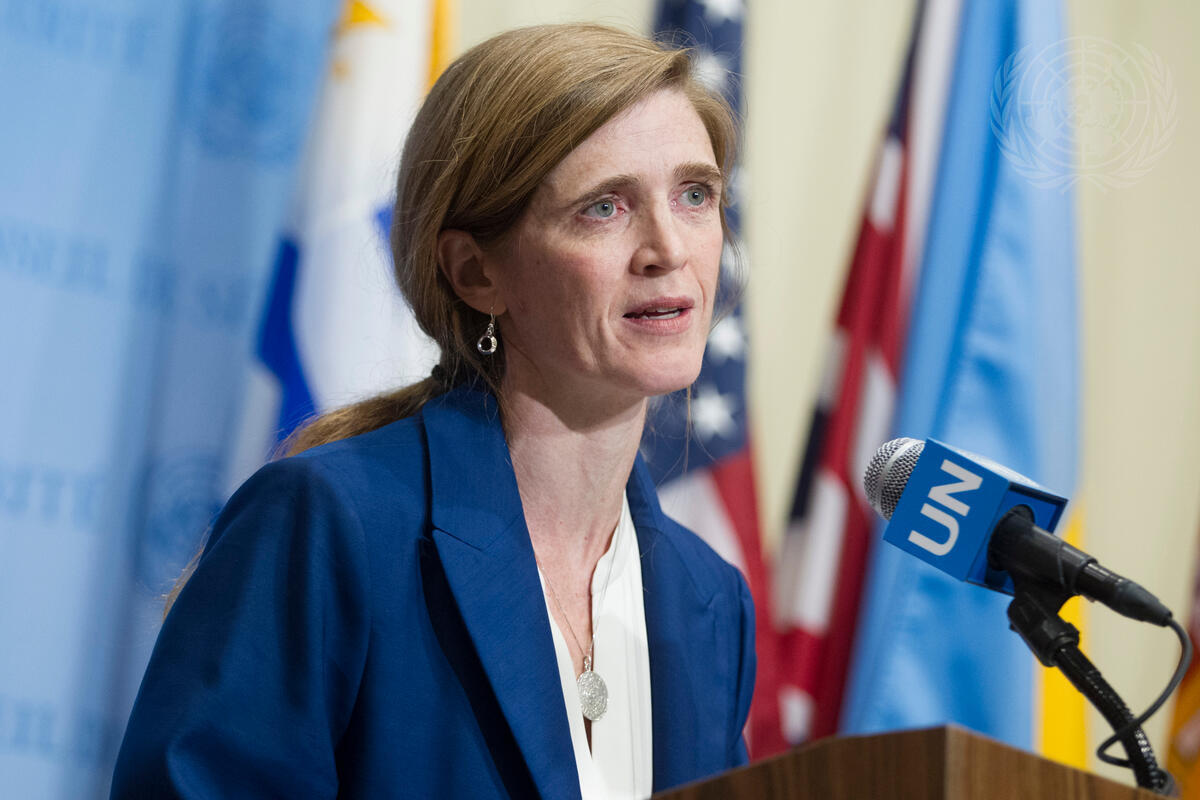 Samantha Power, Permanent Representative of the United States of America to the UN, speaks to journalists following closed Security Council consultations on a draft resolution imposing additional sanctions on the Democratic People’s Republic of Korea (DPRK) for its ballistic missile launch earlier in the month.