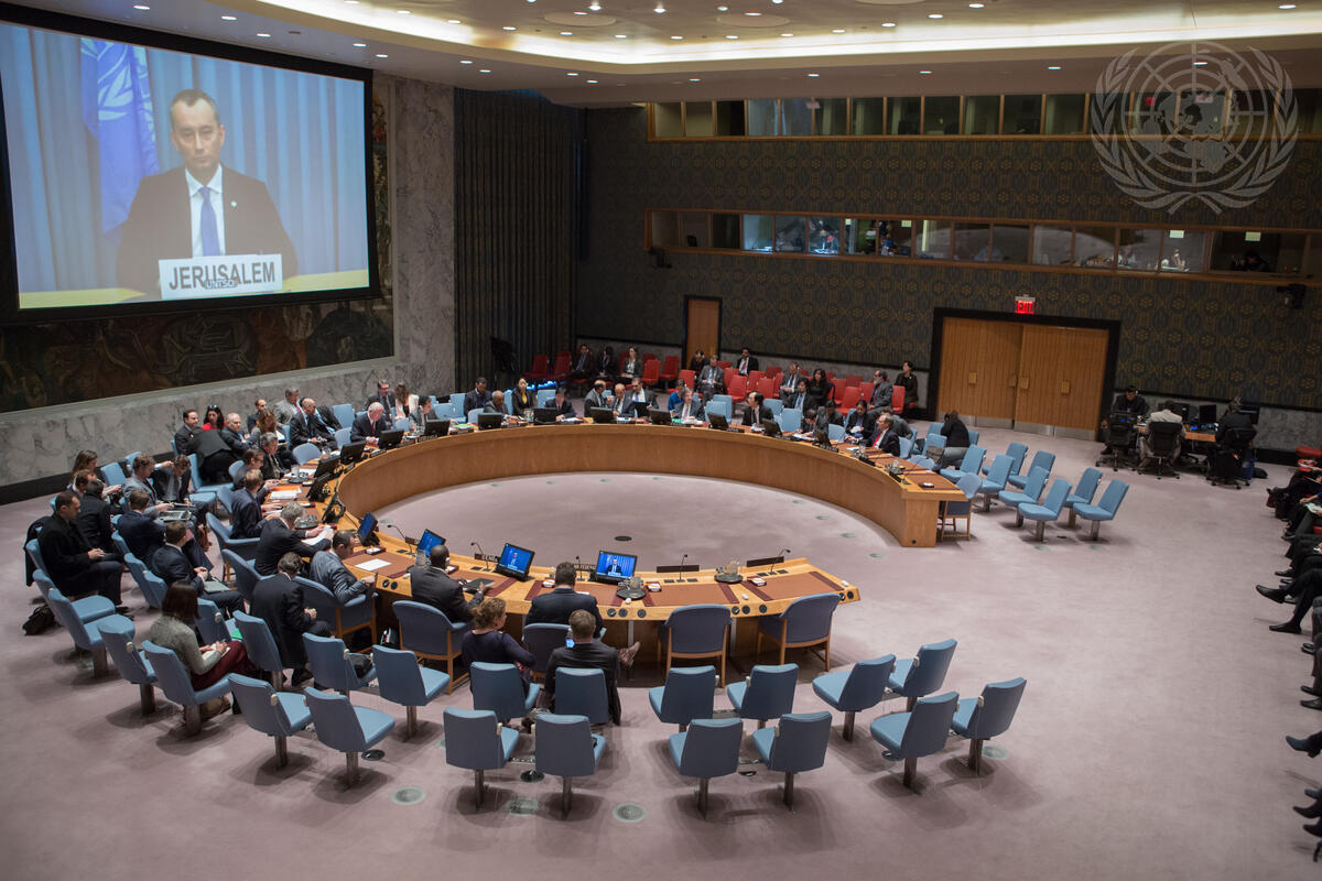 Nickolay Mladenov (shown on screen), UN Special Coordinator for the Middle East Peace Process and Personal Representative of the Secretary-General to the Palestine Liberation Organization and the Palestinian Authority, briefs the Security Council via video teleconference on the Middle East Situation, including the Palestinian question.