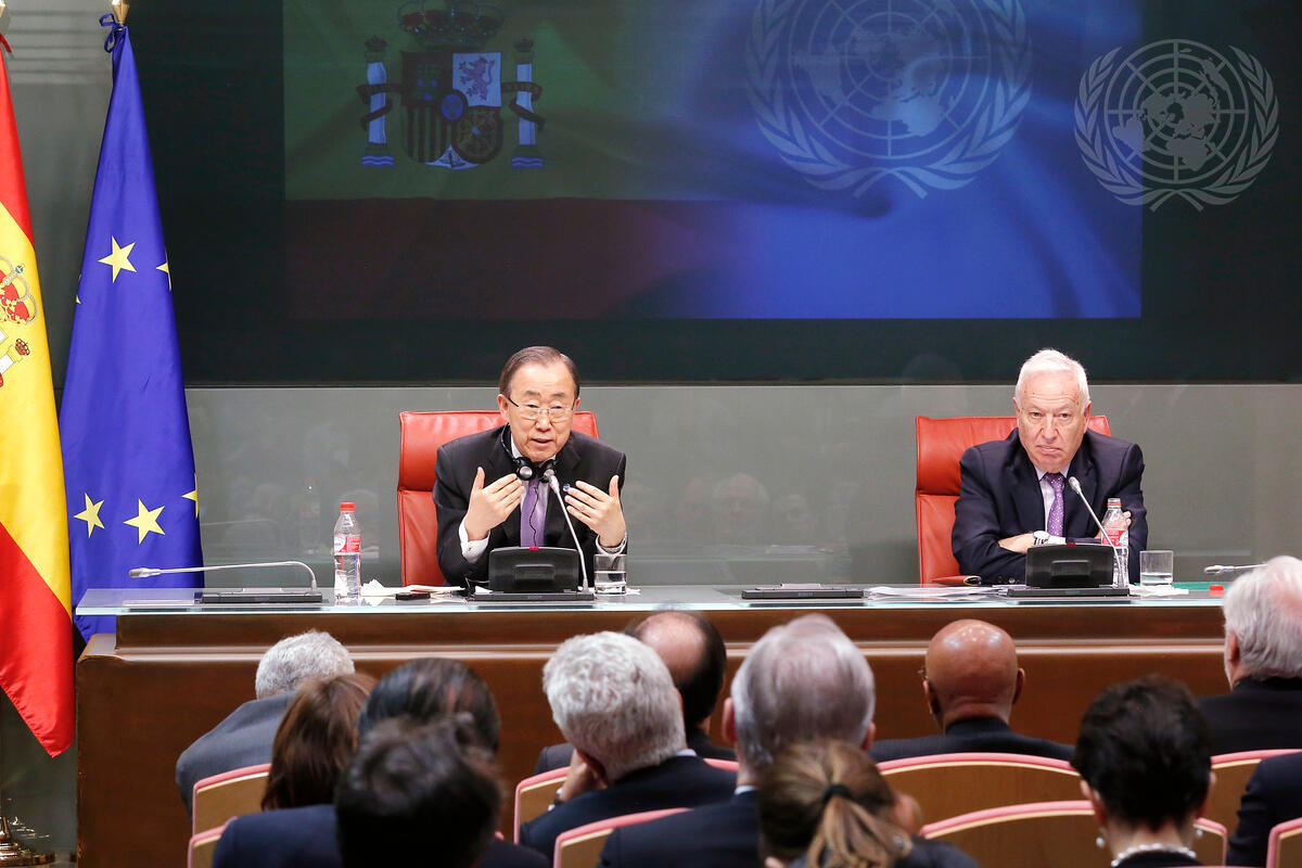 Secretary-General Ban Ki-moon (left) addresses a joint press conference with José Manuel García Margallo, Minister for Foreign Affairs of Spain, in Madrid.