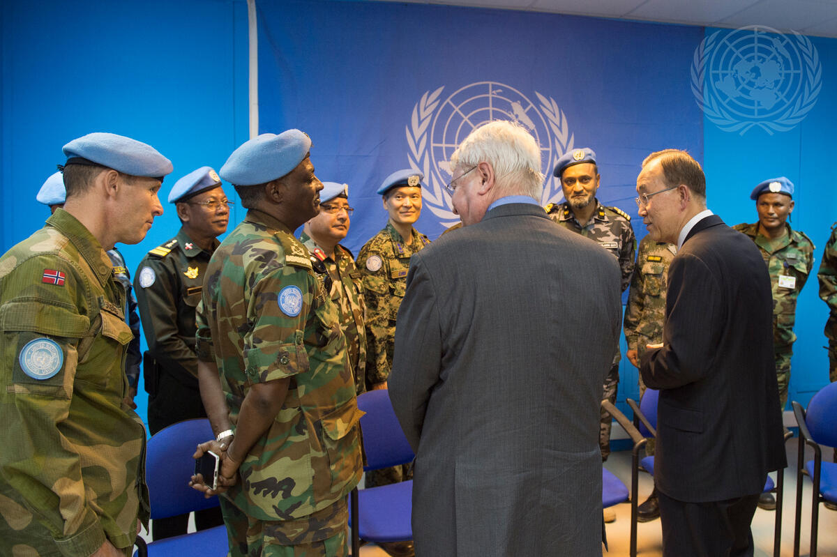 Secretary-General Ban Ki-moon (foreground right) during his meeting with Contingent Commanders of the UN Mission in South Sudan (UNMISS) in Juba. On Mr. Ban’s left is Hervé Ladsous, Under-Secretary-General for Peacekeeping Operations.