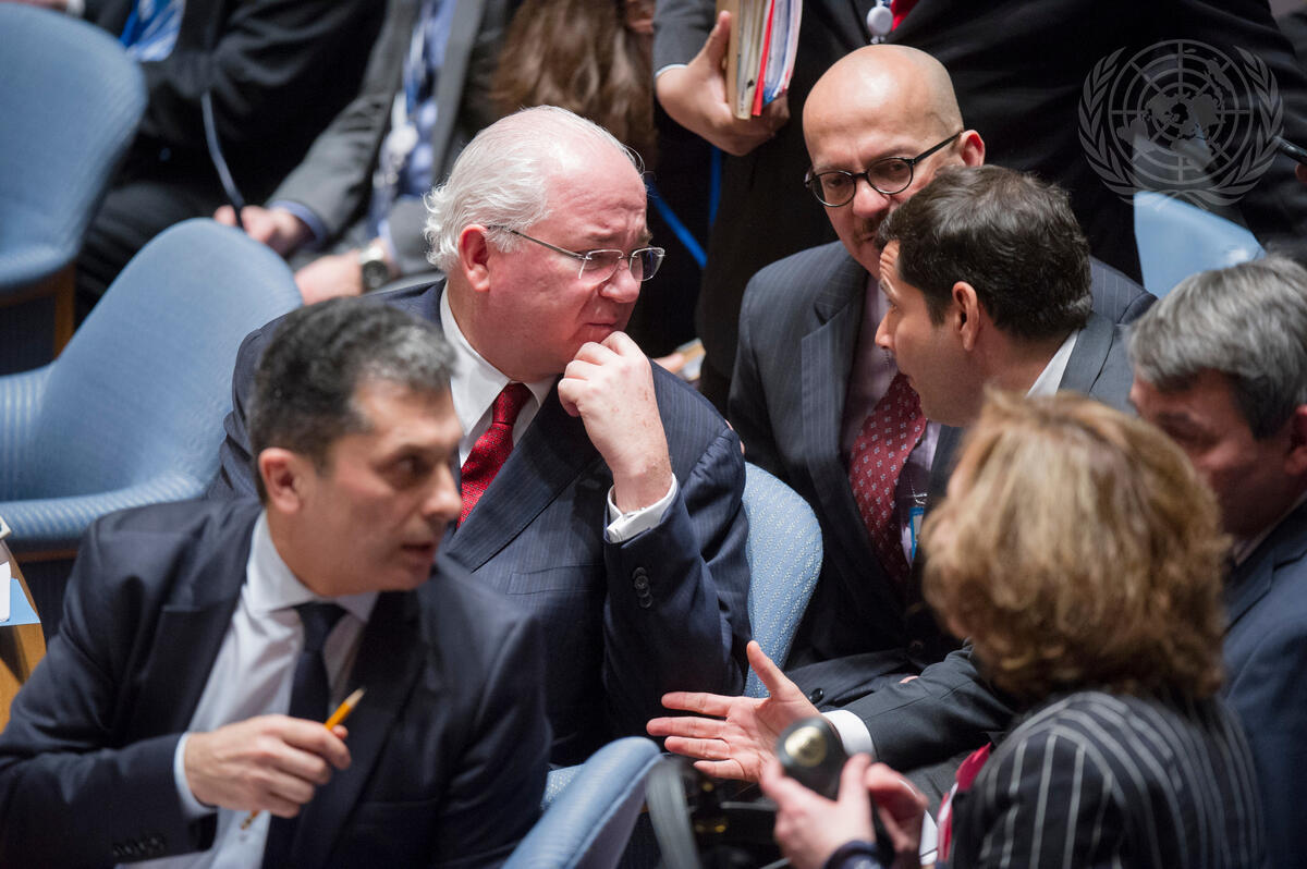 Rafael Darío Ramírez Carreño (centre left), Permanent Representative of the Bolivarian Republic of Venezuela to the UN and President of the Security Council for February, during the meeting. At left is Movses Abelian, Director of the Security Council Affairs Division.