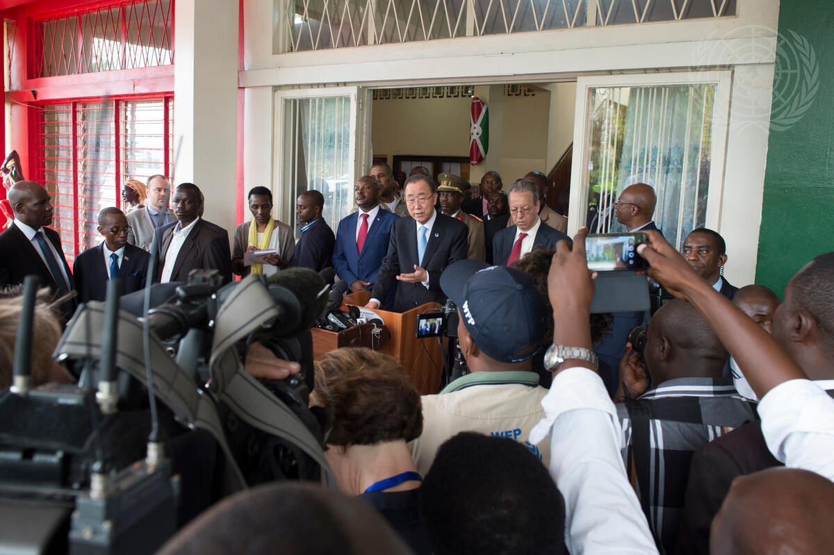 Secretary-General Ban Ki-moon (centre) addresses a press conference in Bujumbura following his meeting with Pierre Nkurunziza, President of the Republic of Burundi. He is flanked by President Nkurunziza (left) and Jamal Benomar, Special Adviser to the Secretary-General.