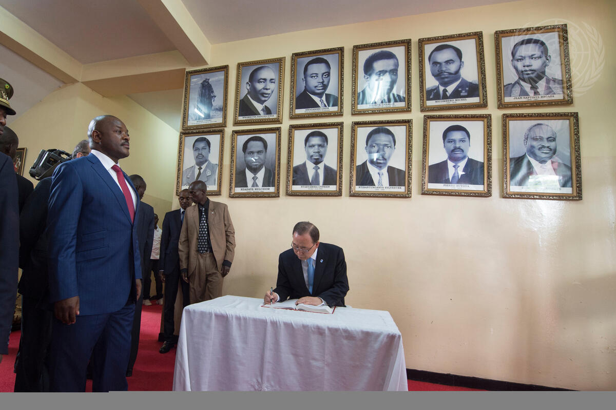 Secretary-General Ban Ki-moon signs the guest book upon his meeting with Pierre Nkurunziza (left, with red tie), President of the Republic of Burundi, in Bujumbura.