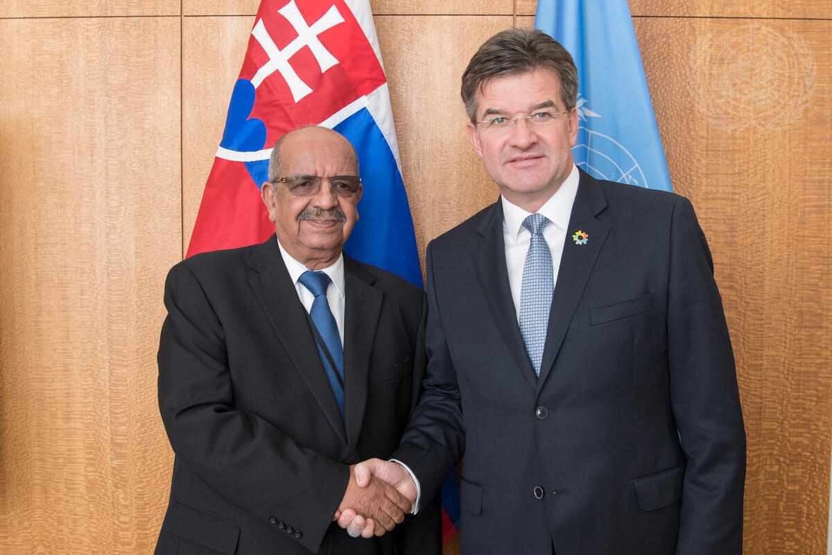 Miroslav Lajcák (right), President of the seventy-second session of the General Assembly, meets with Abdelkader Messahel, Minister for Foreign Affairs of Algeria.