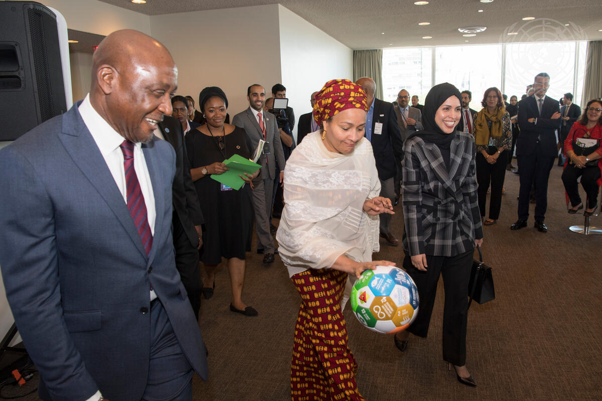 Deputy Secretary-General Amina Mohammed (centre) dribbles a ball during the high-level exhibition on Harnessing the Power of Sport in Achieving Sustainable Development, held on the margins of the General Assembly's annual debate.