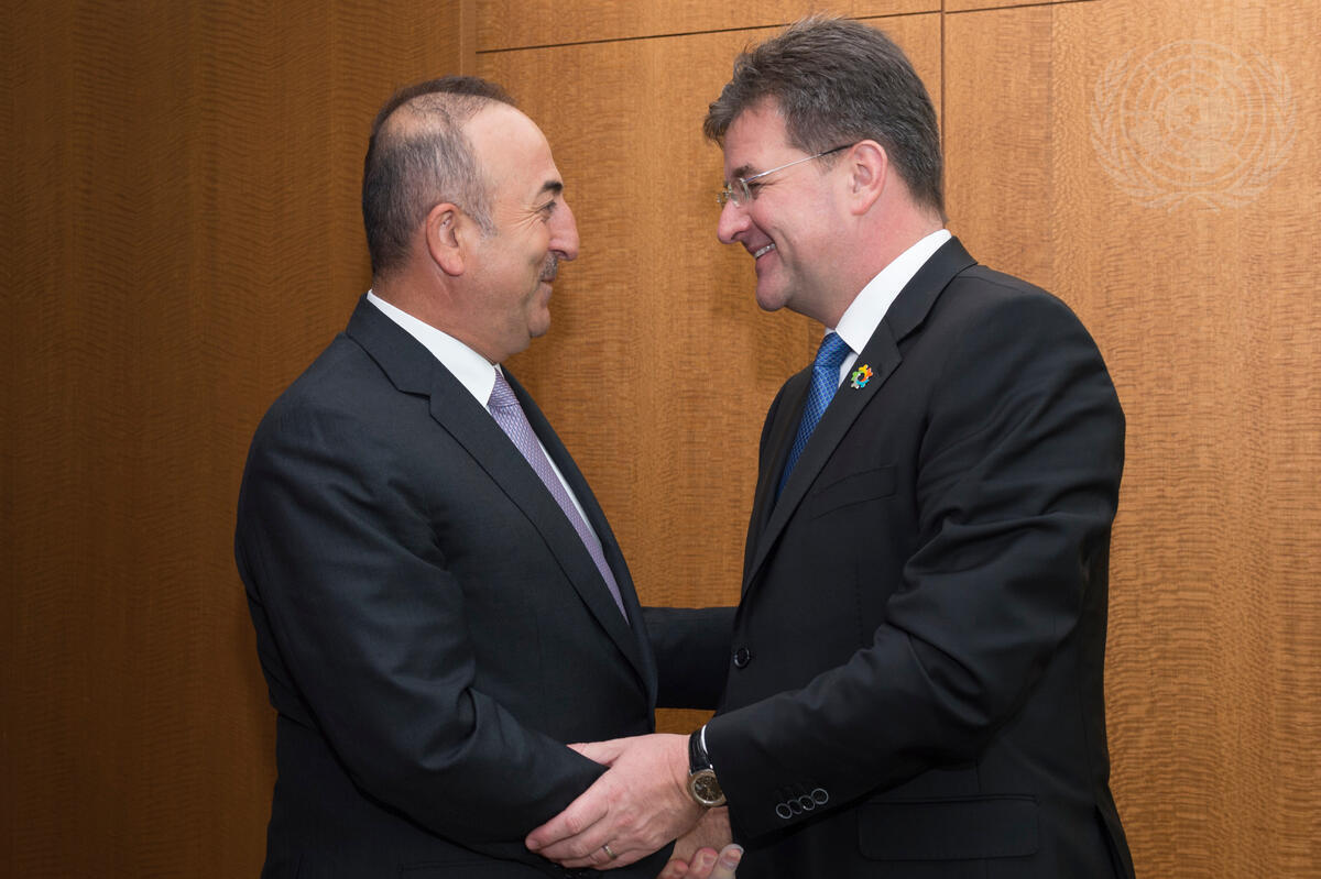 Miroslav Lajcák (right), President of the seventy-second session of the General Assembly, meets with Mevlüt Çavusoglu, Minister for Foreign Affairs of Turkey.
