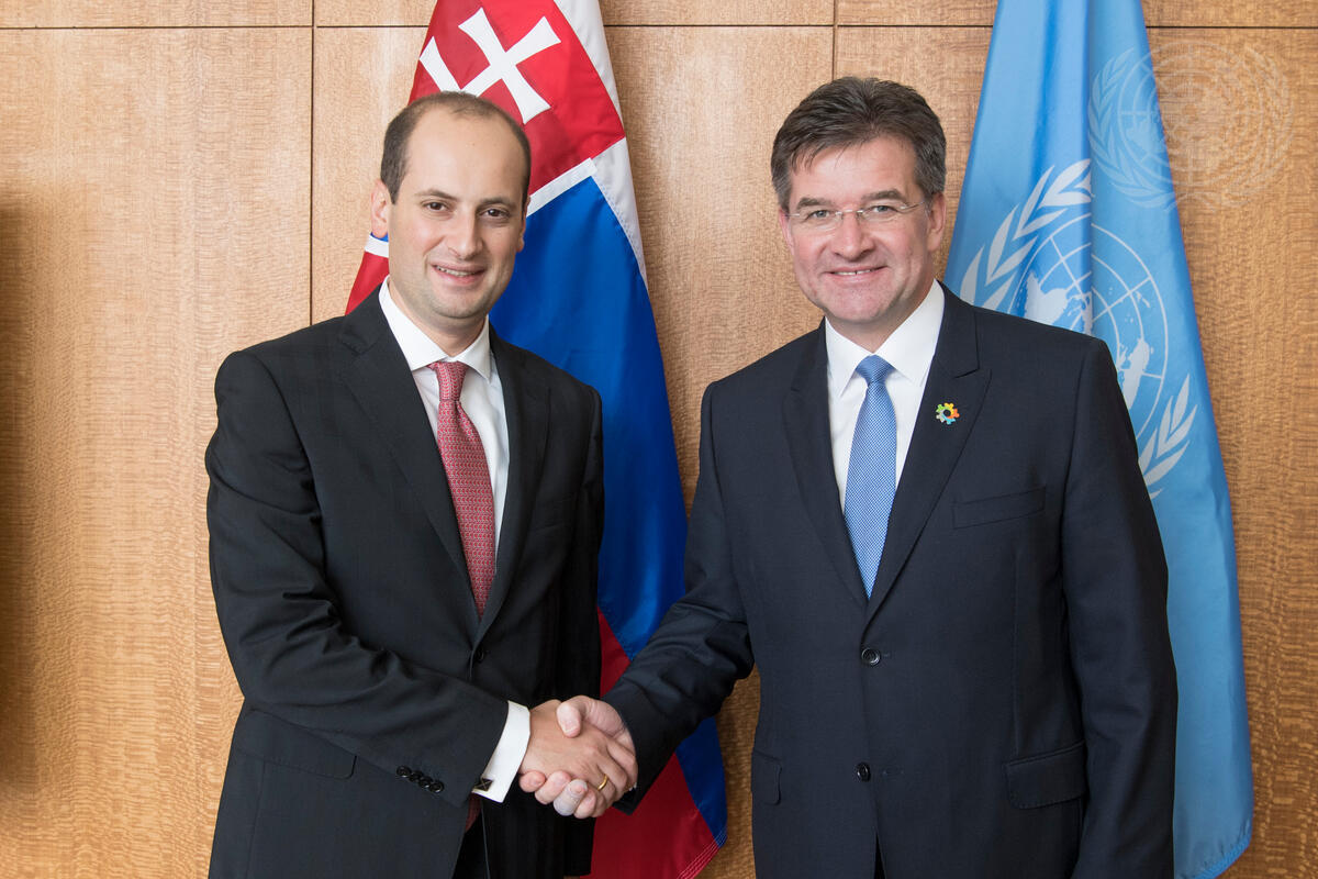 Miroslav Lajcák (right), President of the seventy-second session of the General Assembly, meets with Mikheil Janelidze, Vice Prime Minister and Foreign Minister of Georgia.