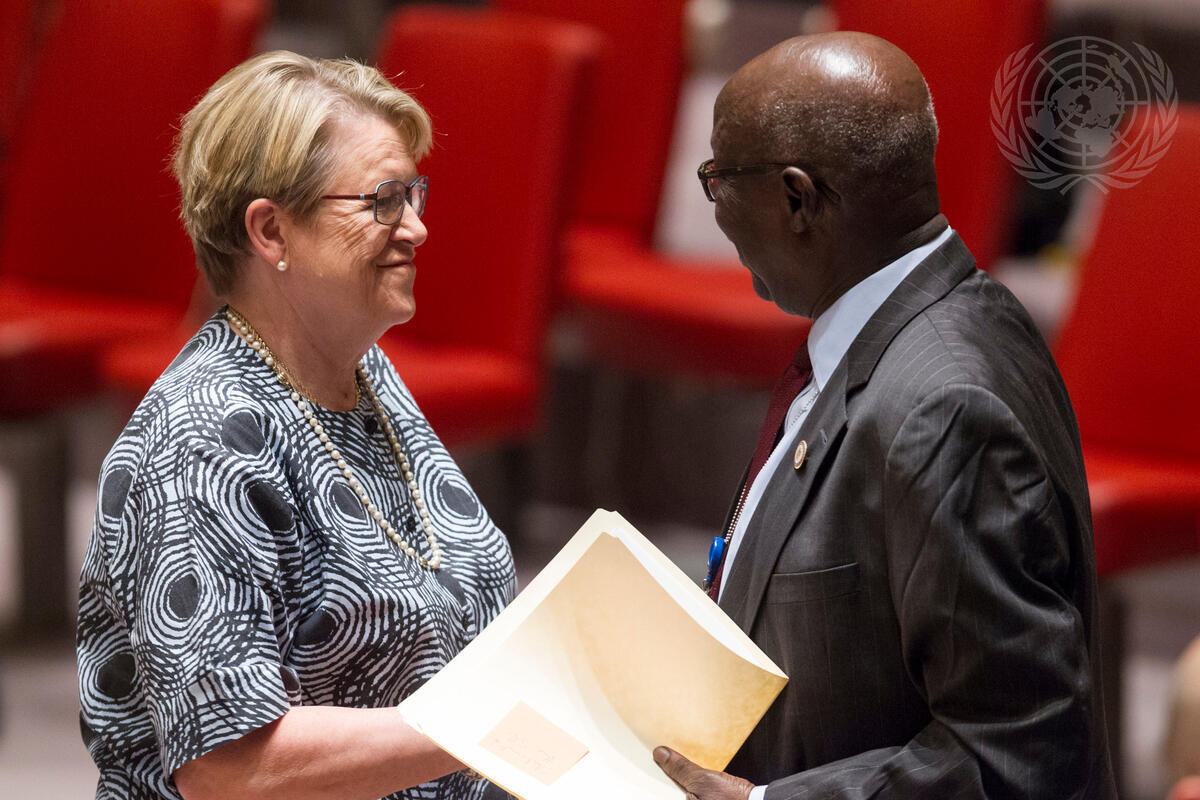 Ellen Margrethe Løj (right), Special Representative of the Secretary-General and Head of the UN Mission in South Sudan (UNMISS), with Francis Mading Deng, Permanent Representative of the Republic of South Sudan to the UN, at Security Council meeting on the situation in the country.