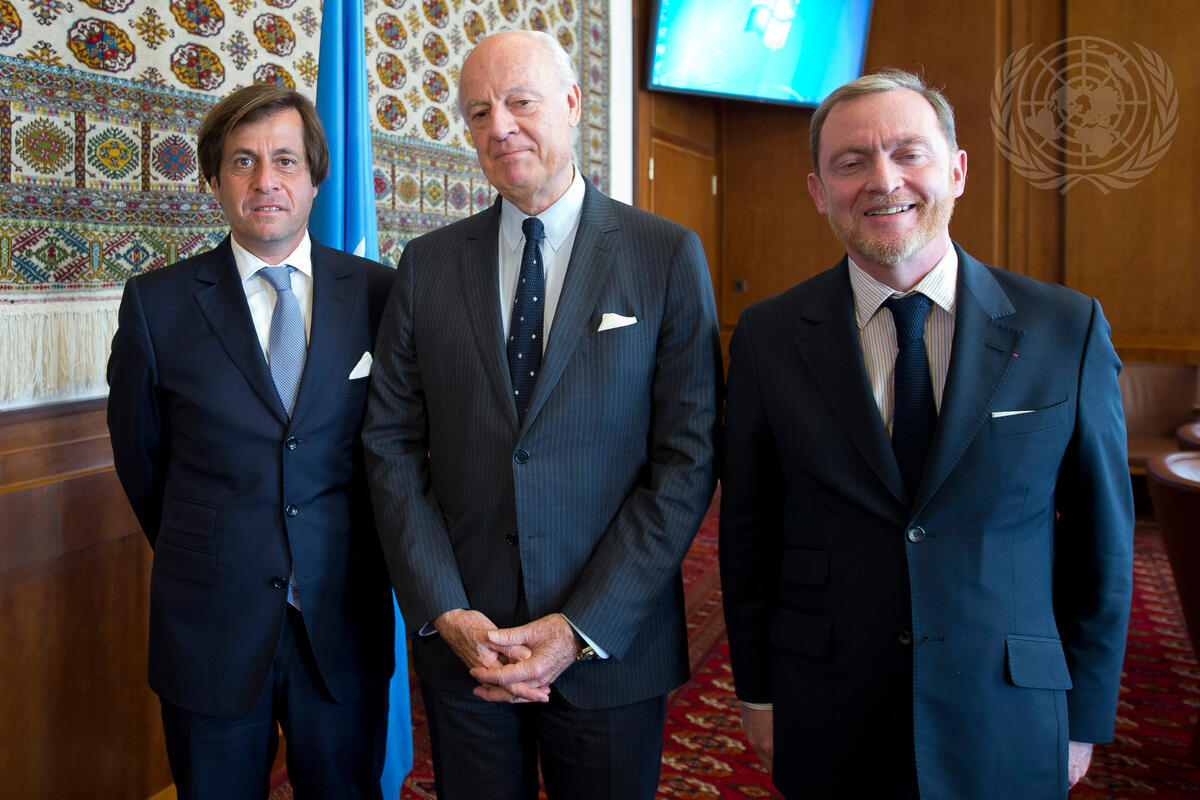 Staffan de Mistura (centre), Special Envoy of the Secretary-General for Syria, meets with Nicolas de Rivière (left), Director General of Political Affairs in the Ministry of Foreign Affairs of France; and Franck Gellet, Ambassador of France in Syria, as part of the ongoing Geneva Consultations on Syria.