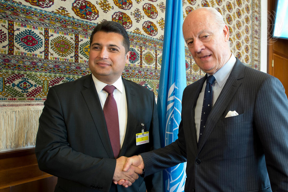Staffan de Mistura (right), Special Envoy of the Secretary-General for Syria, meets with Can Dizdar, Director General for Bilateral Political Affairs (Middle East and South Asia), Ministry of Foreign Affairs of Turkey, as part of the ongoing Geneva Consultations on Syria.