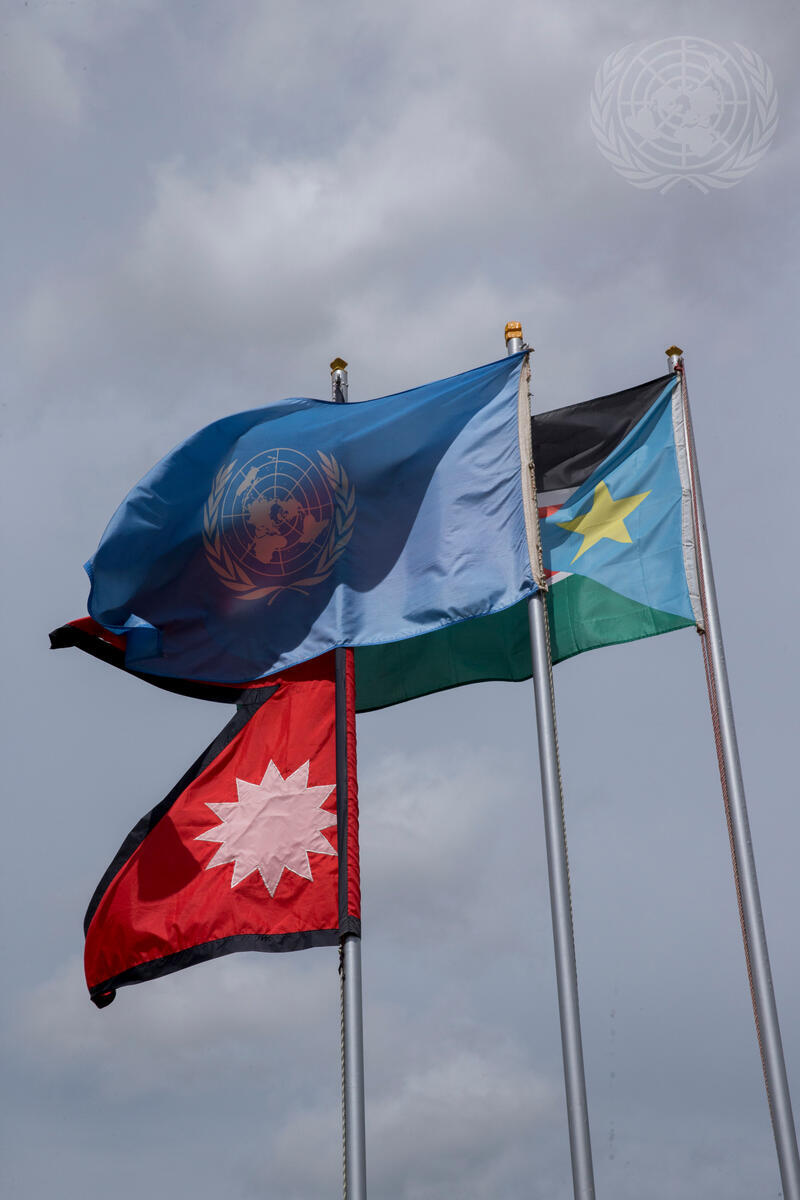 The flag of Nepal flies alongside those of the UN and South Sudan in Juba. Nepalese peacekeepers serving with the UN Mission in Sudan (UNMISS) continue to carry on their duties, as they grieve the heavy losses caused to their countrymen by the recent powerful earthquake in Nepal.