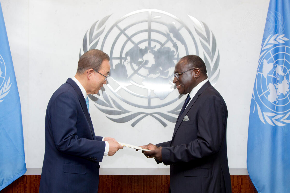 Claude Stanislas Bouah-Kamon (right), new Permanent Representative of Côte d'Ivoire to the United Nations, presents his credentials to Secretary-General Ban Ki-moon.