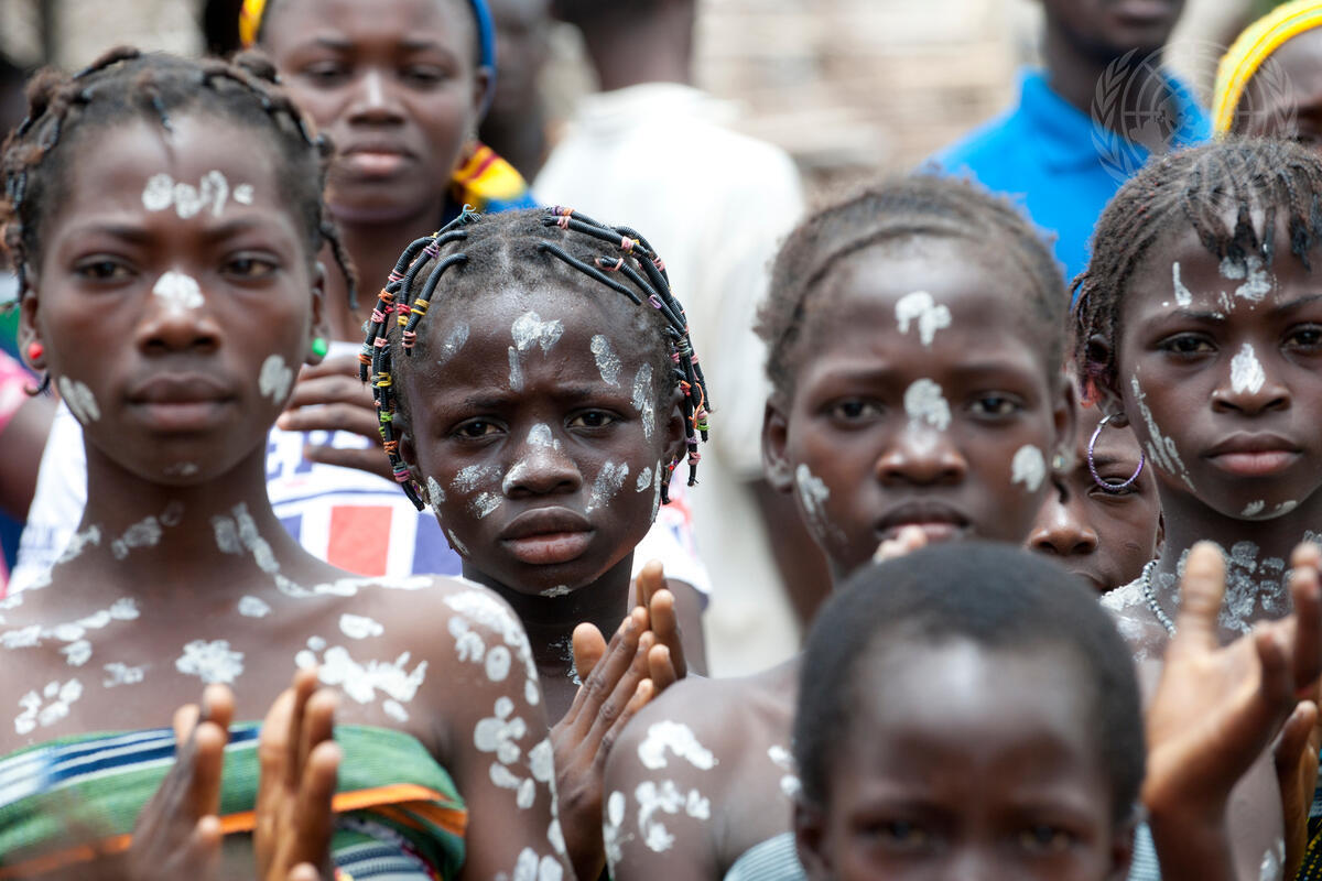 A group of girls from Diai, a village near Toulépleu, Côte d'Ivoire, greet M’Baye Babacar Cissé, Deputy Special Representative for the United Nations Operation in Côte d’Ivoire (UNOCI), who is visiting to attend a community meeting today.
