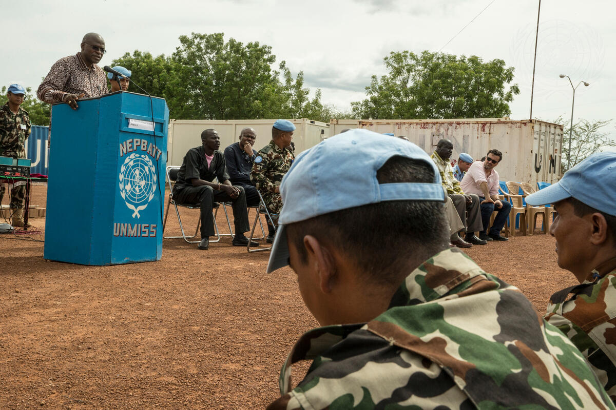 Moustapha Soumaré, Deputy Special Representative (Political) of the Secretary-General for the United Nations Mission in South Sudan (UNMISS), speaks to members of the Nepalese infantry battalion assigned to the UNMISS base in Rumbek, South Sudan to express his condolences for the massive loss of life caused by the recent earthquake in their country of origin.