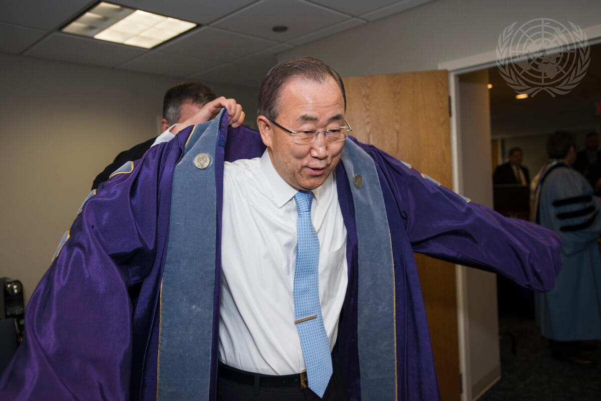 Secretary General Ban Ki-moon dons an academic robe prior to receiving an honorary degree from Georgetown University's School of Foreign Service in Washington D.C and delivering the commencement address.