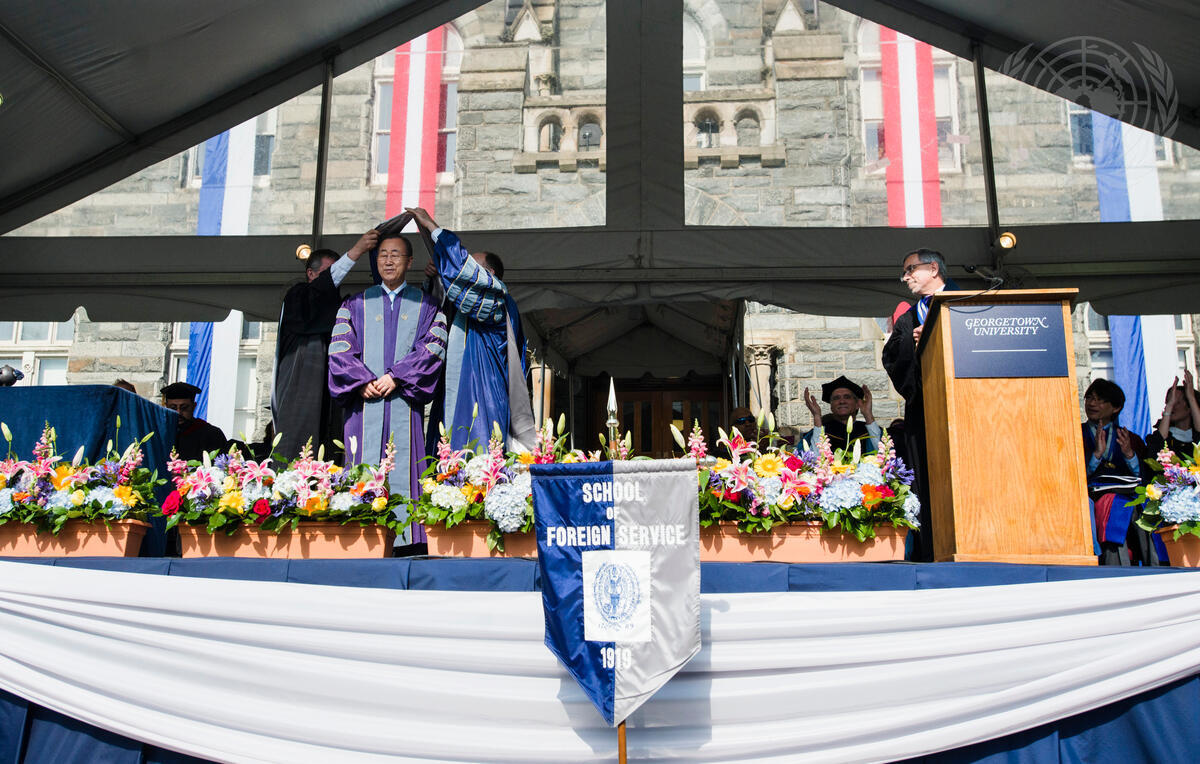 Secretary-General Ban Ki-moon (center left) receives an honorary degree at Georgetown University's School of Foreign Service in Washington D.C.