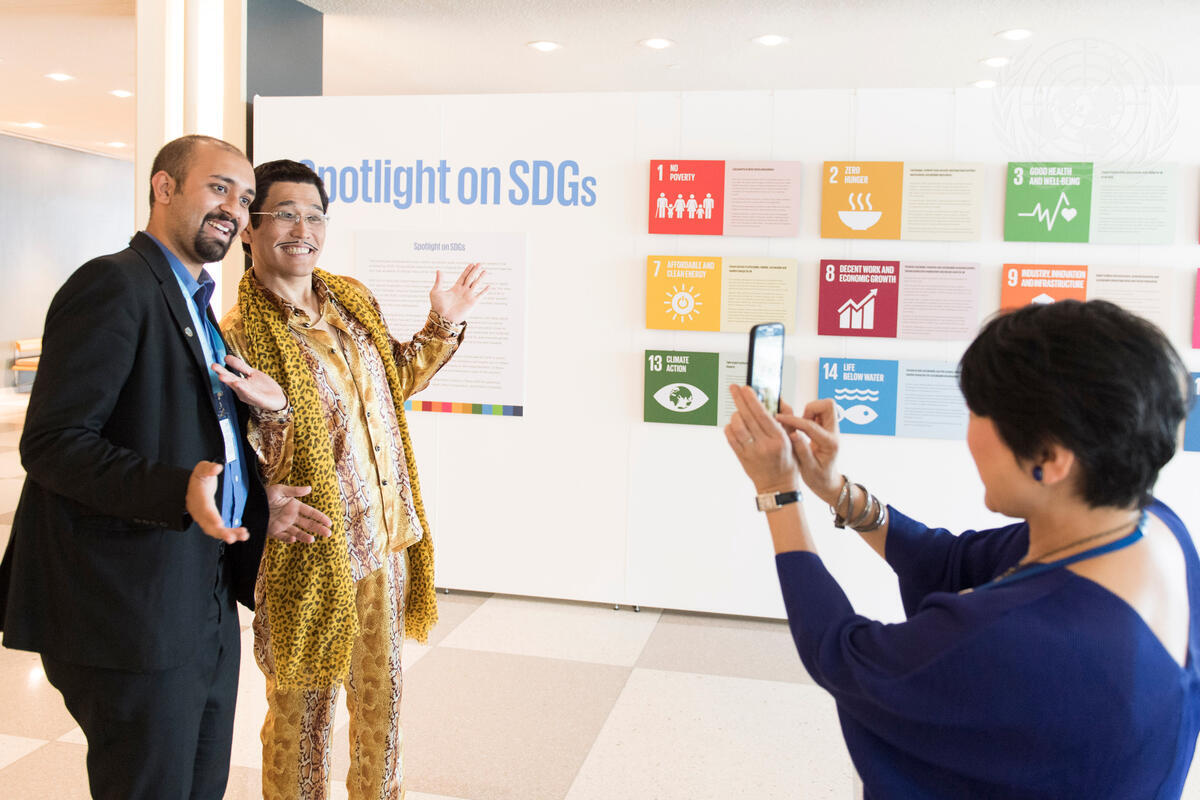 Japanese entertainer Piko Taro visits a “Spotlight on SDGs” exhibition at UN headquarters featuring prize-winning photos taken by students around the world. The YouTube star, famous for his “Pen-Pineapple-Apple-Pen” (PPAP) viral music video, has joined the ranks of celebrities who promote the Sustainable Development Goals (SDGs) on behalf of Governments, the United Nations, civil society and other actors in the global development community.