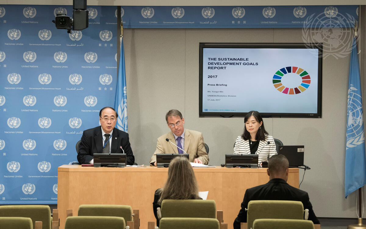Wu Hongbo (left), Under-Secretary-General for Economic and Social Affairs, briefs journalists on the launch of the Sustainable Development Goals (SDGs) Report 2017. Also addressing reporters with him were: Stefan Schweinfest (centre), Director of the UN Statistics Division, Department of Economic and Social Affairs (DESA); and Yongi Min, Chief of the SDG Monitoring Unit, UN Statistics Division.