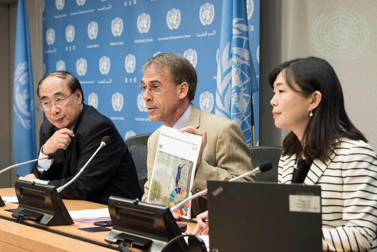 Stefan Schweinfest (centre), Director of the UN Statistics Division, Department of Economic and Social Affairs (DESA), briefs journalists on the launch of the Sustainable Development Goals (SDGs) Report 2017. He is flanked by Wu Hongbo (left), Under-Secretary-General for Economic and Social Affairs; and Yongi Min, Chief of the SDG Monitoring Unit, UN Statistics Division.