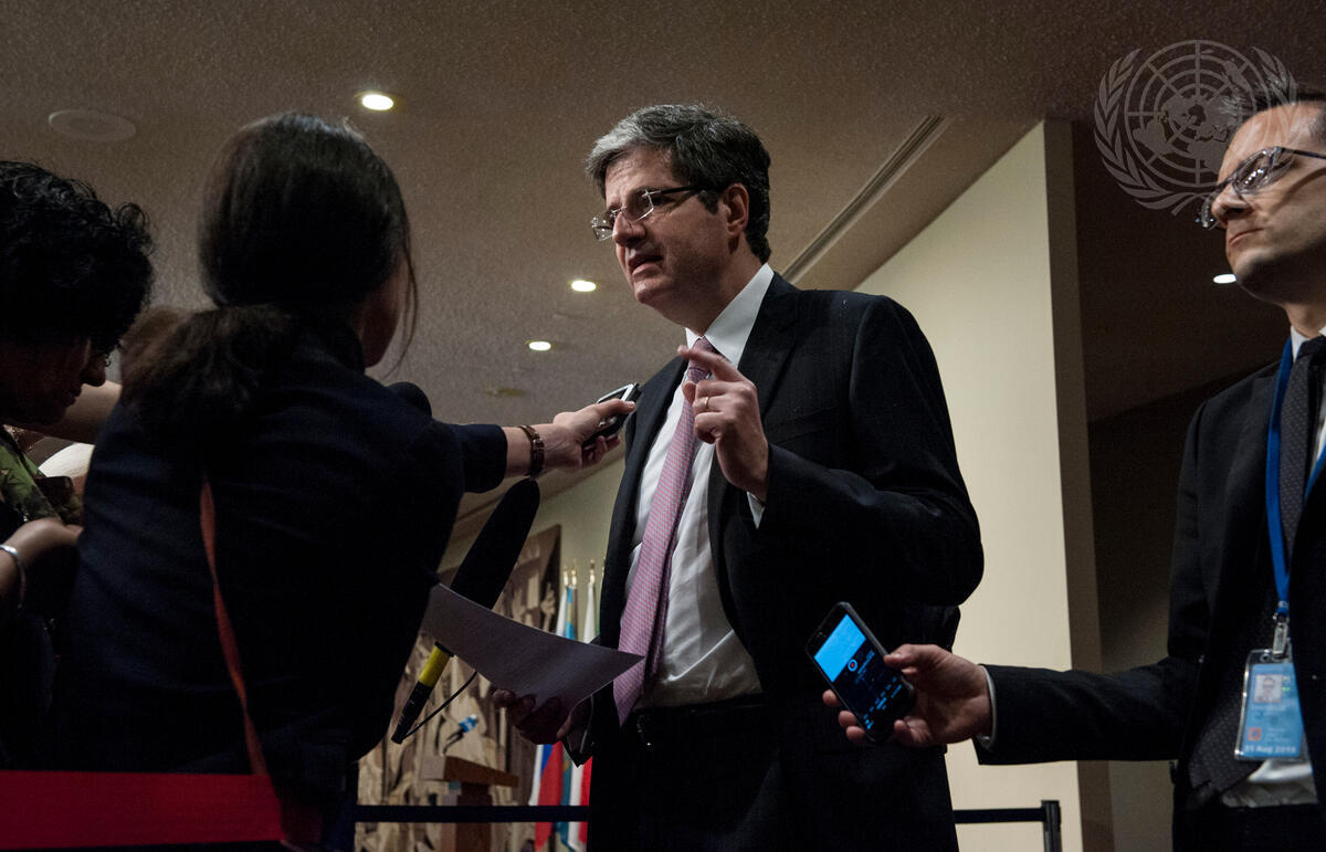 François Delattre, Permanent Representative of France to the UN, speaks to journalists.
