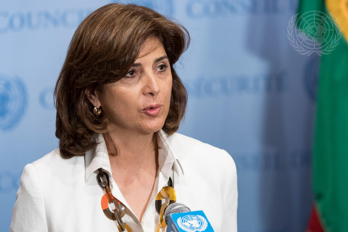 María Ángela Holguín Cuéllar, Minister for Foreign Affairs of Colombia, speaks to journalists following the Security Council meeting.
