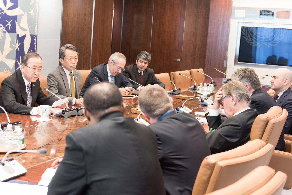 Secretary-General Ban Ki-moon (top left) meets with senior advisers, including Deputy Secretary-General Jan Eliasson (foreground centre), on the underground nuclear test announced by the Democratic People’s Republic of Korea (DPRK) on 6 January. Also pictured: Jeffrey Feltman (foreground, second from left), Under-Secretary-General for Political Affairs; Kim Won-soo (top, centre left), Acting UN High Representative for Disarmament Affairs; and Stéphane Dujarric (top, centre right), Spokesperson for the Secretary-General.