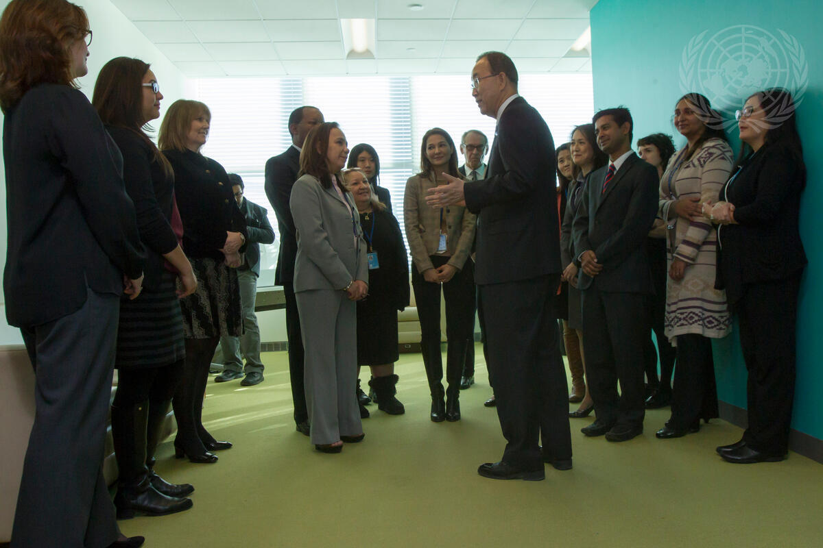 Secretary-General Ban Ki-moon addresses staff members at the Office of Internal Oversight Services during his new-year round of visits to Secretariat Departments and Offices with Deputy Secretary-General Jan Eliasson. Pictured listening to Mr. Ban with the staff, Heidi Mendoza (in grey pant suit) Under-Secretary-General for Internal Oversight Services.