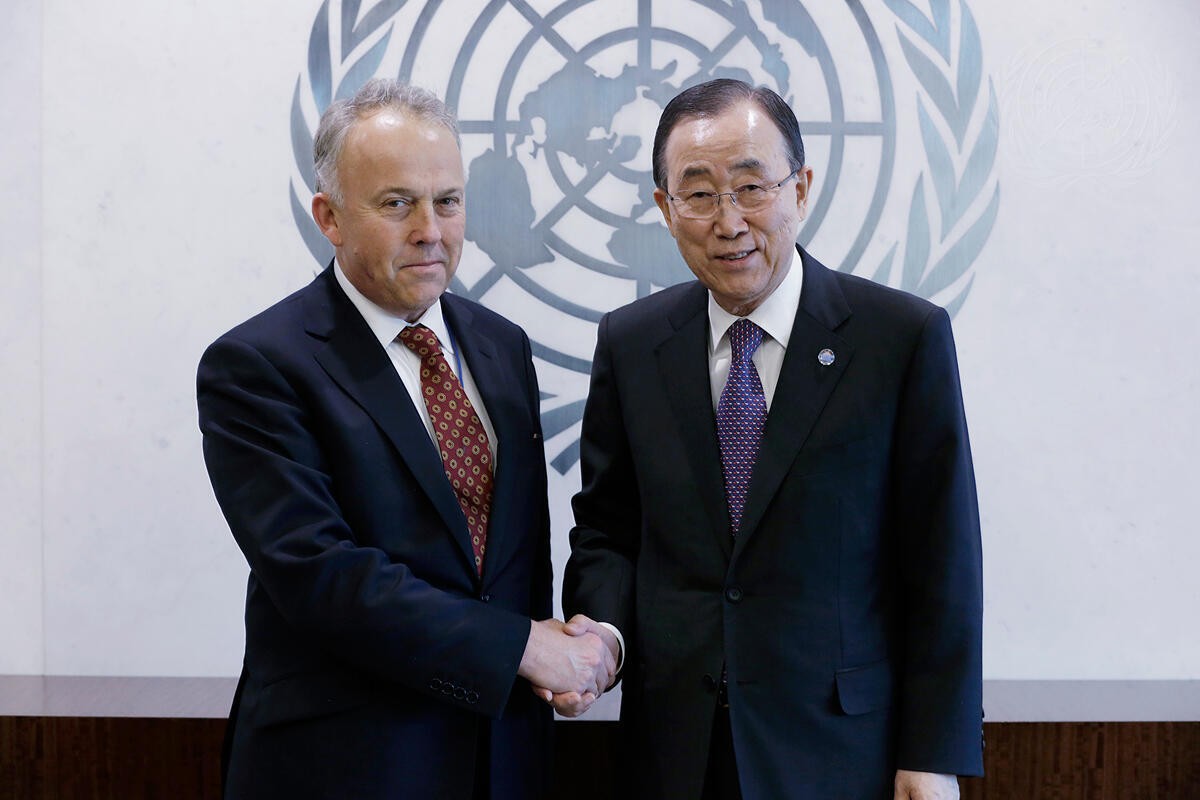Secretary-General Ban Ki-moon (right) meets with Michael Keating, his Special Representative-designate and incoming Head of the United Nations Assistance Mission in Somalia (UNSOM).