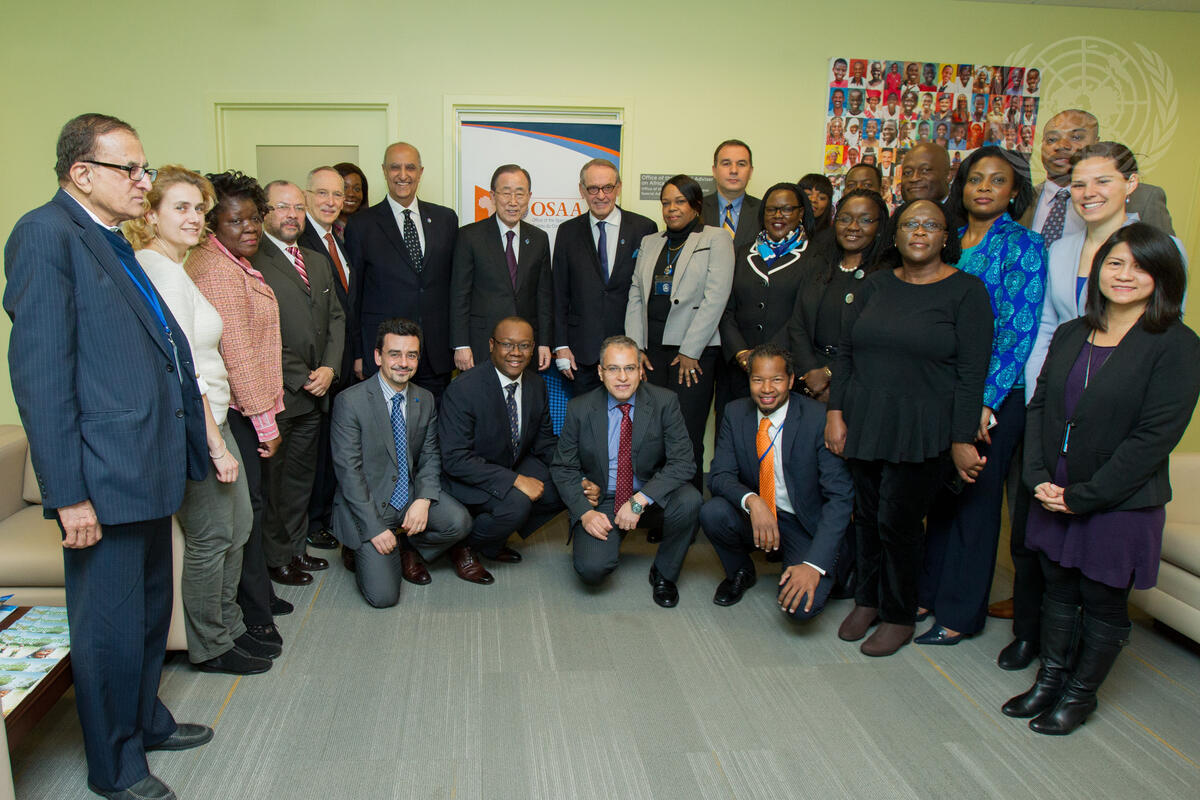 Secretary-General Ban Ki-moon (top centre) poses for a group photo with staff at the Office of the Special Adviser on Africa, during his new-year round of visits to UN Secretariat Departments and Offices. He is flanked by Maged Abdelaziz, (left), the Special Adviser; and Deputy Secretary-General Jan Eliasson.