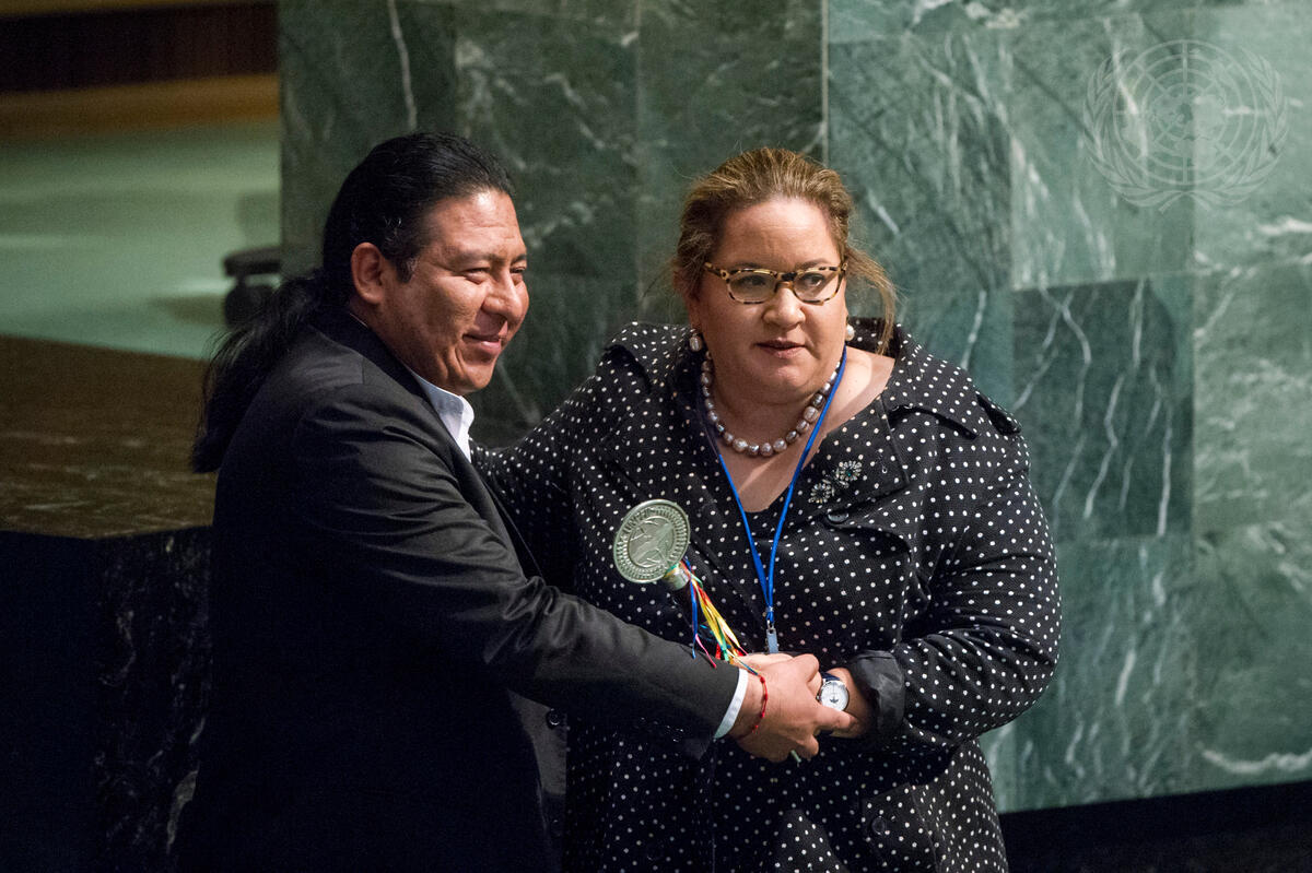 Megan Davis, 2014-2016 Chairperson of the United Nations Permanent Forum on Indigenous Issues, passes the baton to newly elected Chair, Álvaro Esteban Pop, at the opening meeting of the Fifteenth session of the Permanent Forum on Indigenous Issues (UNPFII). This year's theme is ""Indigenous Peoples: Conflict, Peace and Resolution"".