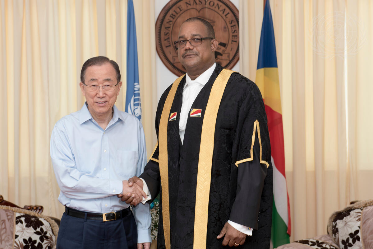 Secretary-General Ban Ki-moon (left) greets Patrick Herminie (right), Speaker of the National Assembly of the Seychelles and addresses the National Assembly and Youth Parliamentarians.