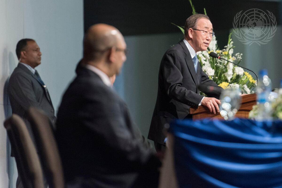 Secretary-General Ban Ki-moon (right) addresses a special event on the implementation of the Sustainable Development Goals, in Port Louis, Mauritius, where he said that small island developing States have unique vulnerabilities.