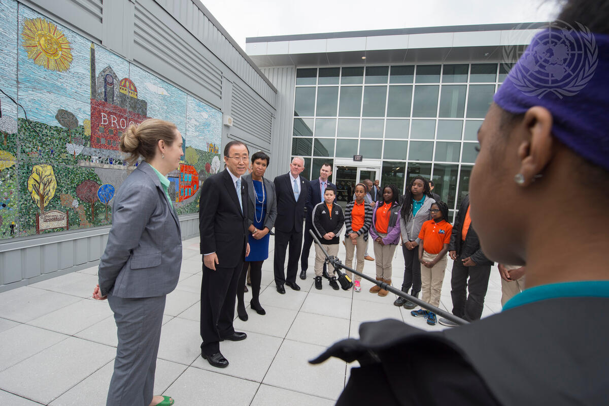 While in Washington, D.C., to attend the Climate Action 2016 summit, Secretary-General Ban Ki-moon visited Brookland Middle School to see green projects that the school is implementing. He was accompanied on his visit to the school by Mayor Muriel Elizabeth Bowser of the District of Columbia.