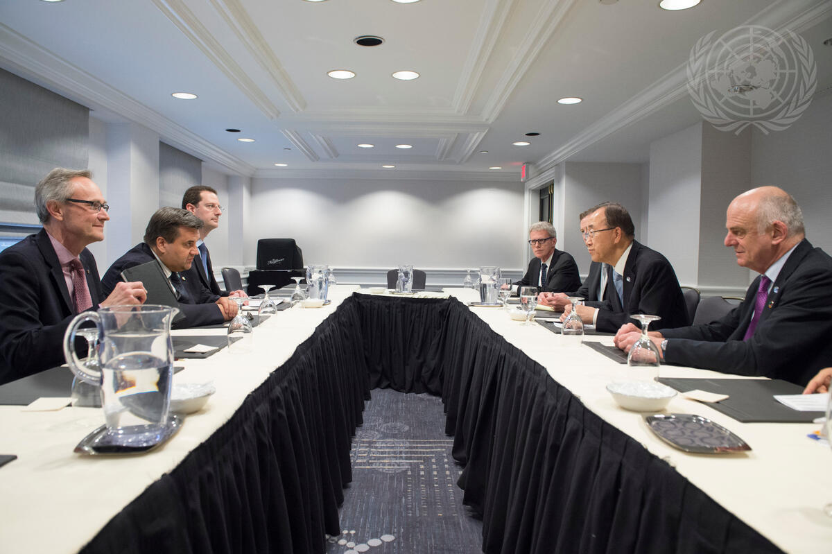 Secretary-General Ban Ki-moon (second from right) meets with Denis Coderre (second from left), Mayor of Montréal, Canada, in Washington, D.C. Also pictured, David Nabarro (right), the Secretary-General’s Special Adviser on the 2030 Agenda for Sustainable Development.