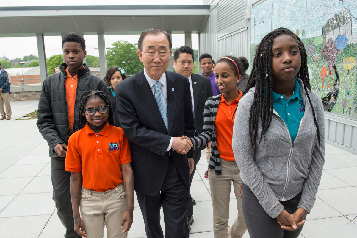 While in Washington, D.C., to attend the Climate Action 2016 summit, Secretary-General Ban Ki-moon visited Brookland Middle School to see green projects that the school is implementing. He was accompanied on his visit to the school by Mayor Muriel Elizabeth Bowser of the District of Columbia.