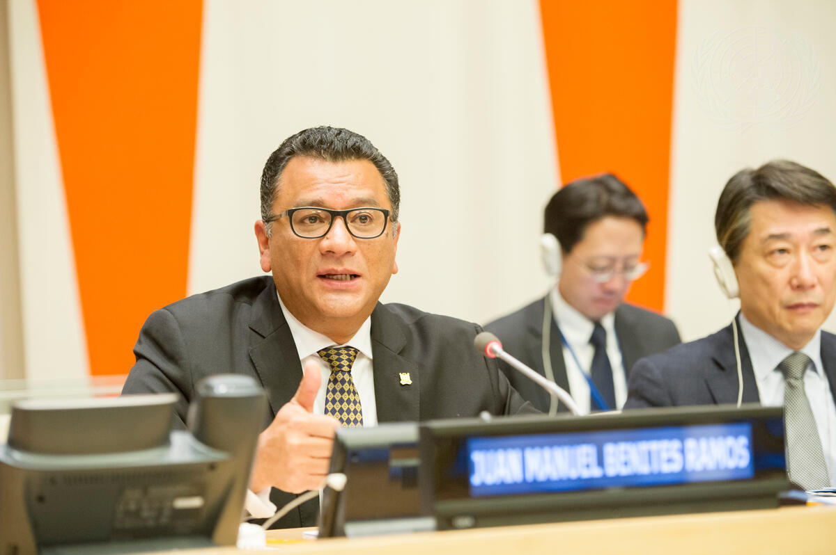 Juan Manuel Benites Ramos (left), Minister for Agriculture and Irrigation of Peru, addresses a special of the Economic and Social Council (ECOSOC) on “The impacts of the 2015/16 El Niño phenomenon: Reducing risks and capturing opportunities”. At right is Oh Joon, Permanent Representative of the Republic of Korea to the UN and President of ECOSOC.