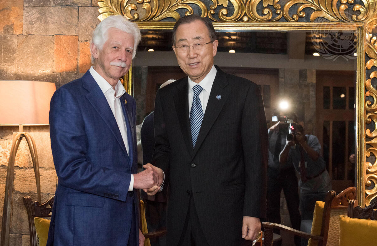 Secretary-General Ban Ki-moon (right) meets with Paul Raymond Bérenger, Leader of the Opposition of the Republic of Mauritius.