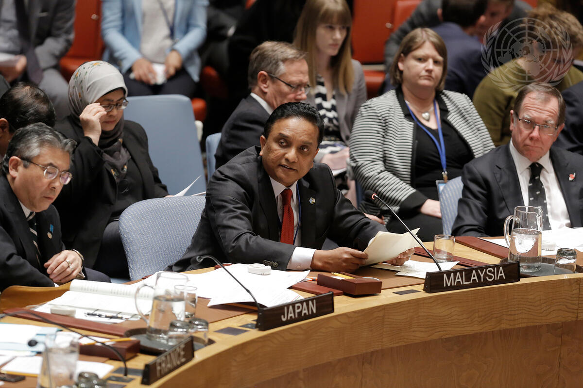Reezal Merican Naina Merican (centre), Deputy Minister for Foreign Affairs of Malaysia, addresses the Security Council open debate on “Threats to international peace and security caused by terrorist acts: Countering the narratives and ideologies of terrorism”. He is flanked by Shinsuke Sugiyama (left), Deputy Minister for Foreign Affairs of Japan; and Murray McCully, Minister for Foreign Affairs of New Zealand.