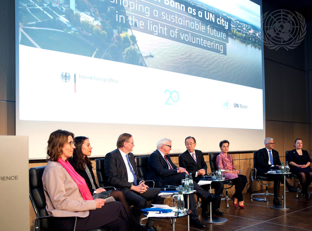 Secretary-General Ban Ki-moon (fifth from left) during a special event in commemoration of the 20th anniversary of the presence of United Nations offices in Bonn, Germany. He is flanked by Frank-Walter Steinmeier (left), Minister for Foreign Affairs of Germany; and Christiana Figueres, Executive Secretary of the UN Framework Convention on Climate Change (UNFCCC).
