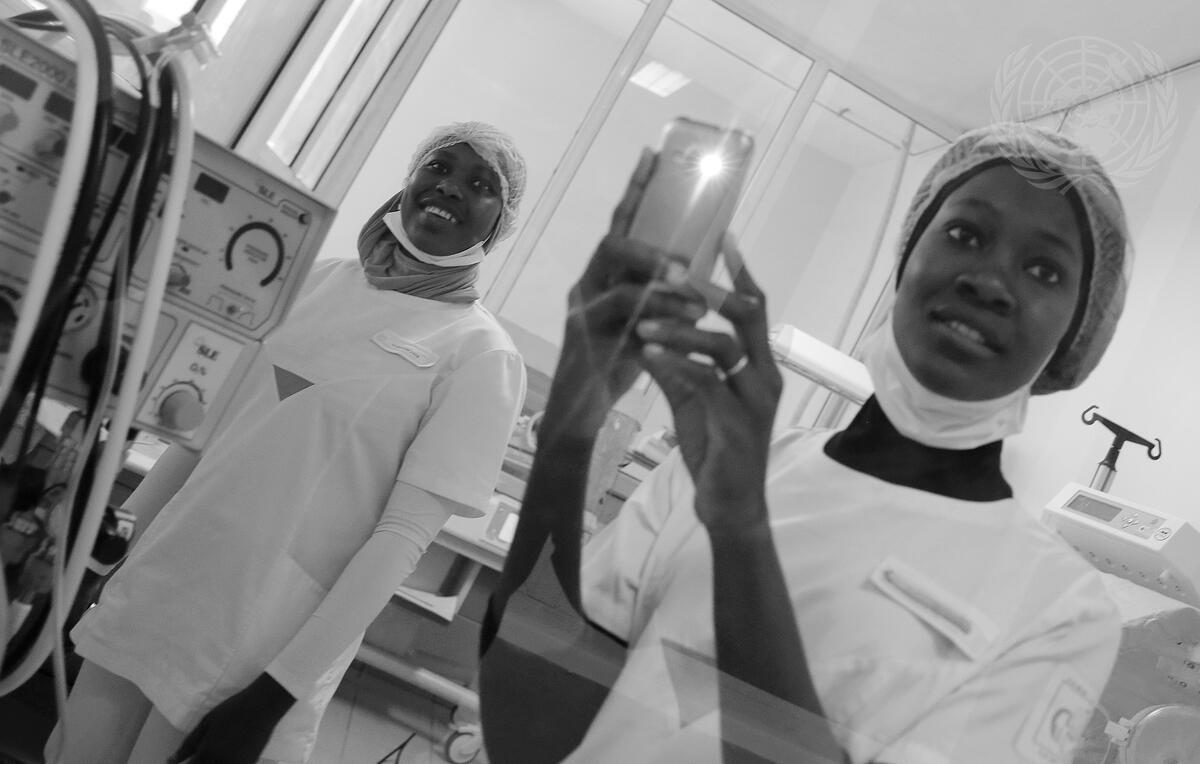 Two staff members at the Mother-Child Hospital in Nouakchott smile for a quick snapshot during the UN Secretary-General's visit to the facility.