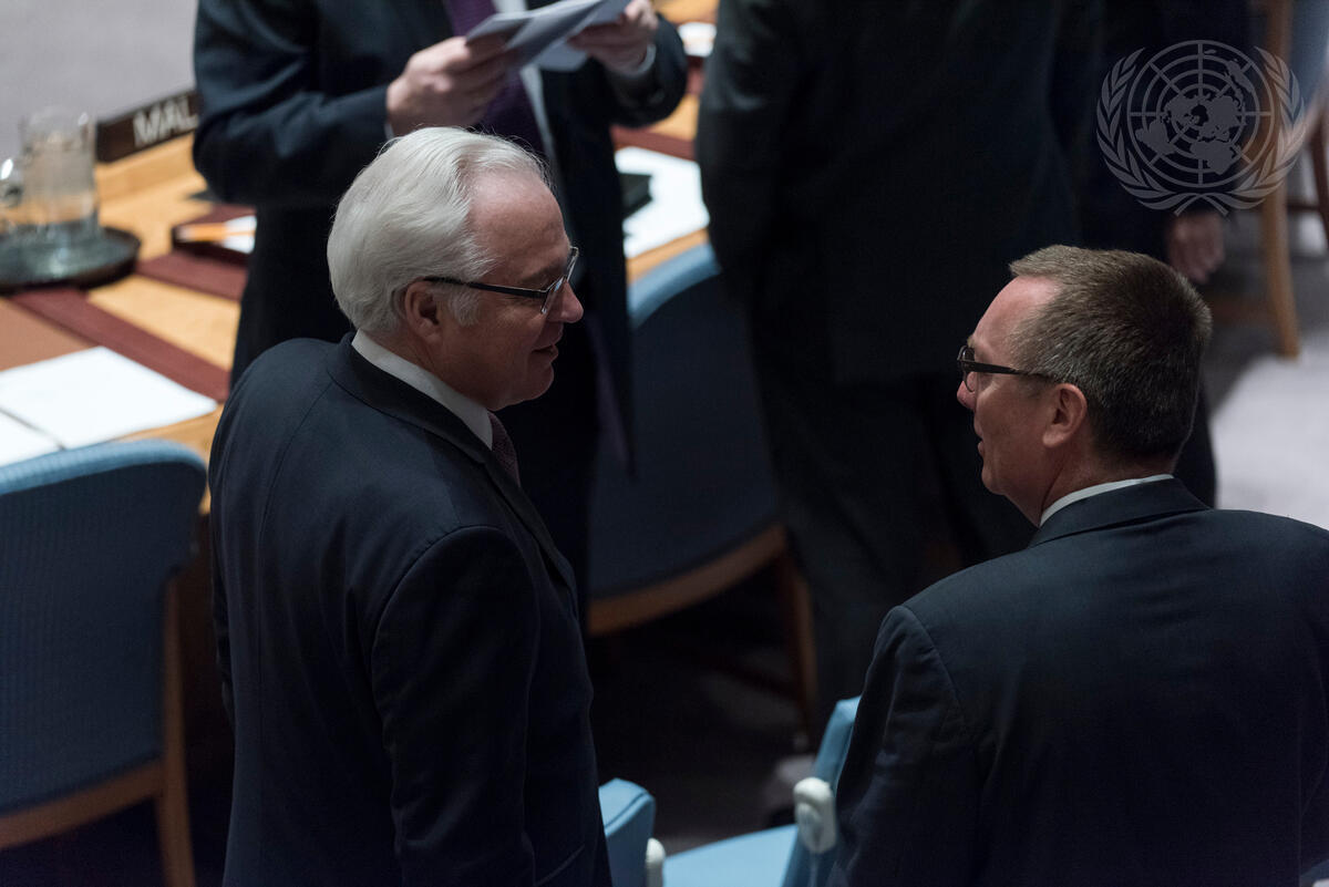 Vitaly I. Churkin (left), Permanent Representative of the Russian Federation to the UN, with Jeffrey Feltman, Under-Secretary-General for Political Affairs, at the Council meeting.